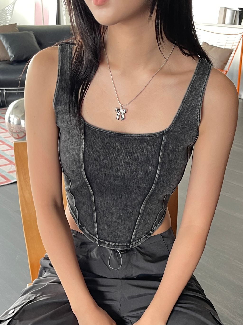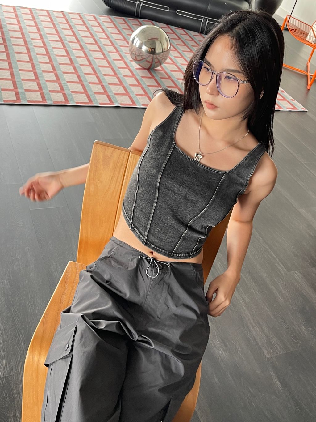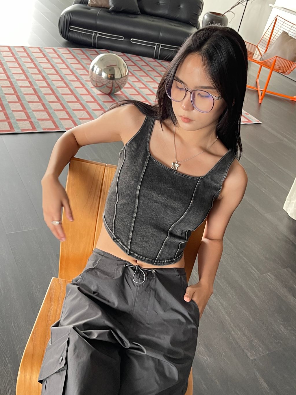 这款也是这一期强推的款看似牛仔的面料 实际是透气的水洗色“假”牛仔辣妹型修身立体版型仿鱼骨造型 收腰立裁 小蛮腰即视感满满都是我爱的细节老客都知道我真的很爱圆弧下摆 真的遮肉合身而不束缚 胸部包裹度特别好 贴个胸贴就行柔软亲肤 运动都可以穿他!!