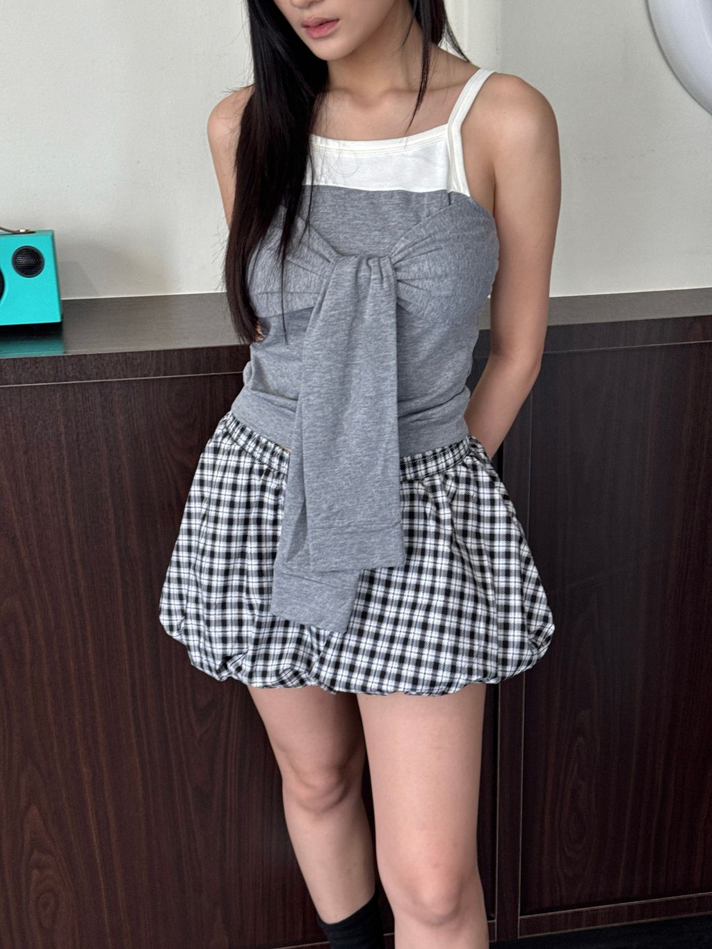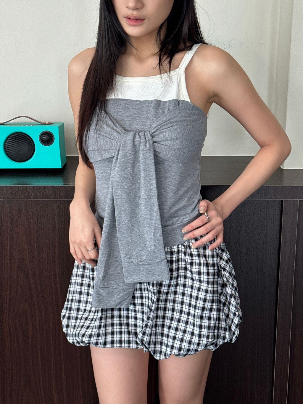 背心拼接绑带抹胸的独特设计做的假袖子绑带两片在胸前打结包裹胸部更显圆润 显得腰更细